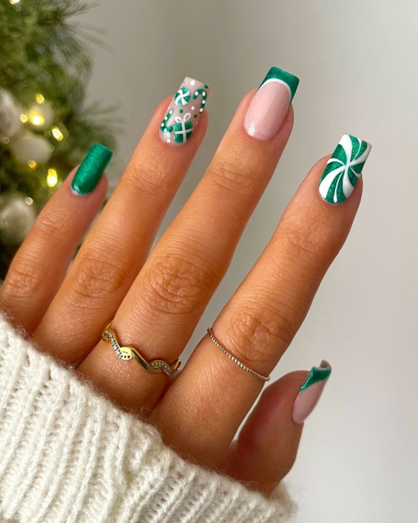 The French manicure gets a festive upgrade in December. Swap the white tips for red glitter, emerald green, or even candy cane stripes. It is a sophisticated nod to the season that looks great on any nail length.